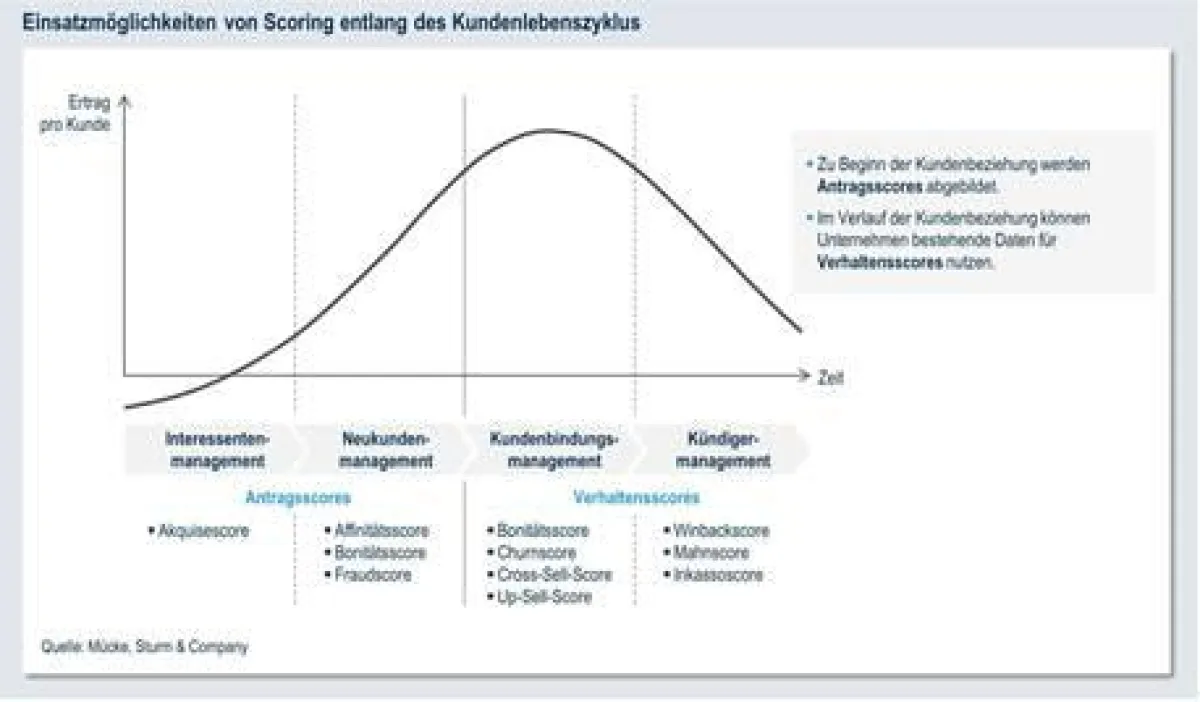 Die Darstellung entlang des Kundenlebenszyklus illustriert, dass Scoring in nahezu allen Branchen Anwendung finden kann. Einzige Grundvoraussetzung zur Entwicklung und Nutzung eigener Scoring-Modelle ist ein ausreichender Bestand interner Daten. Unternehmen, welche zunehmend Informationen und Daten über ihre Kunden gewinnen, können somit künftig die Möglichkeiten des Scorings besser ausschöpfen – im Rahmen der zulässigen Datenschutzbestimmungen.