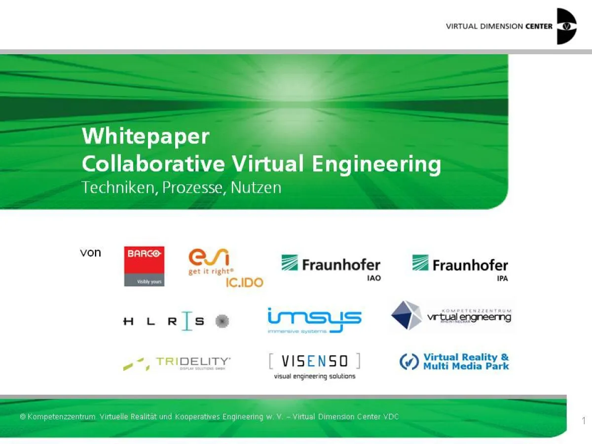Das Whitepaper „Collaborative Virtual Engineering“ gibt einen Überblick über verschiedene Kooperationstechniken, deren Nutzen sowie Einsatzszenarien. Es kann kostenfrei heruntergeladen werden unter: http://www.vdc-fellbach.de/downloads .