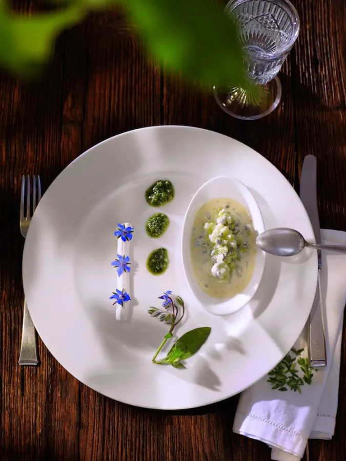 Rezept-Tipp: Gurken-Borretschkaltschale mit Borretschpesto und Ziegenfrischkäse mit Borretschblüten