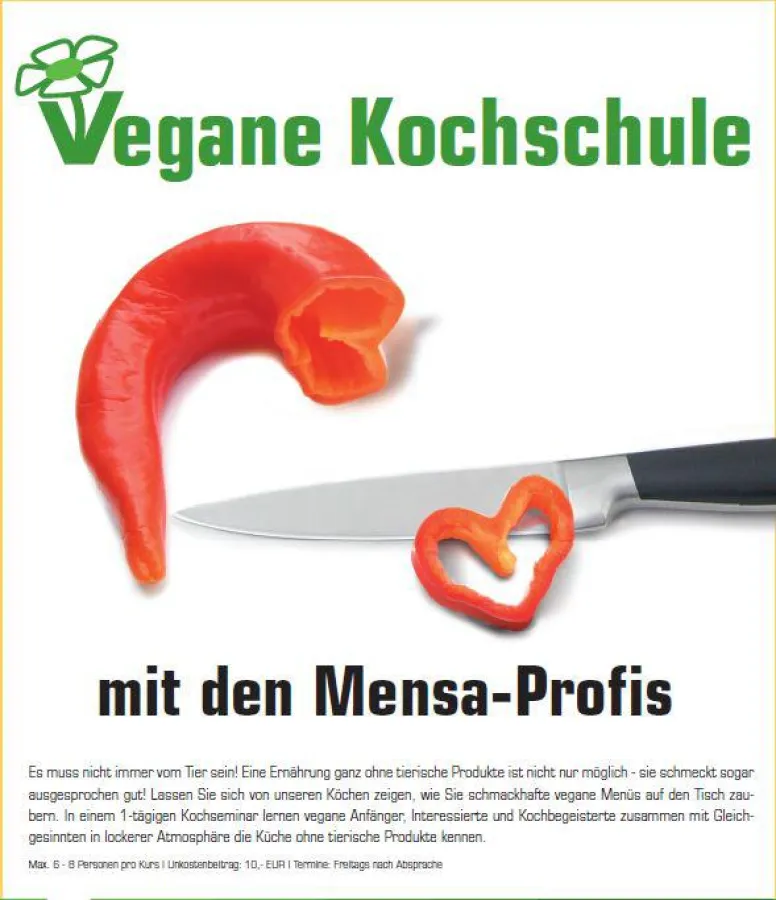 Als einen ersten Schritt bietet das Studierendenwerk Trier seit einigen Monaten immer häufiger auch vegane Gerichte an. Weil diese auch bei den Nicht-Veganern sich zunehmender Beliebtheit erfreuen, entschloss sich das Studierendenwerk in Zusammenarbeit mit einer passionierten Veganerin die 1. vegane Kochschule zu organisieren.