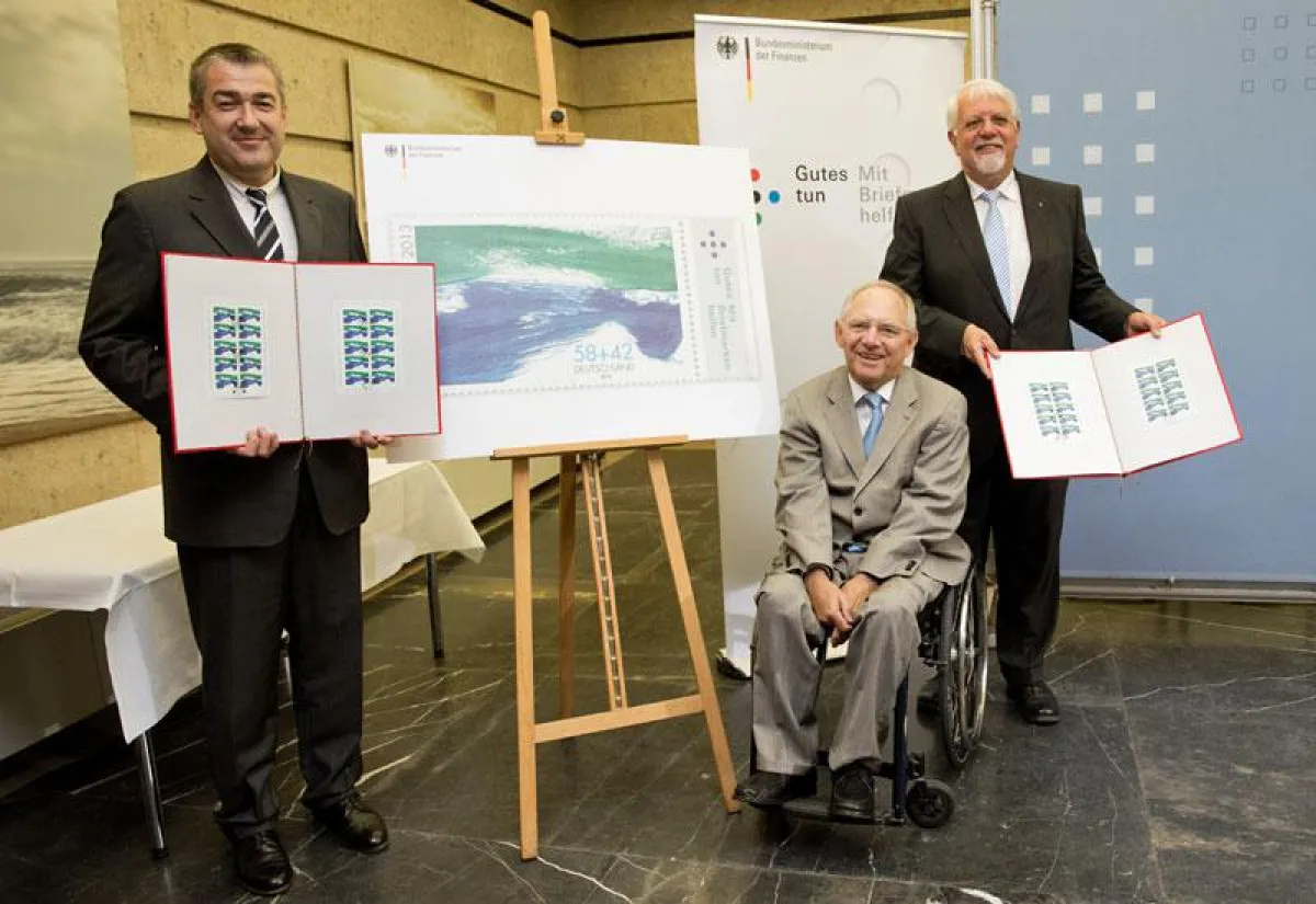 Johannes Stockmeier erhielt zudem von Jürgen Gerdes einen Scheck in Höhe von einer Million Euro. Dieser Betrag wird zusammen mit weiteren Zuschlagserlösen aus dem Markenverkauf Hochwasseropfern zur Verfügung gestellt. Die Marke im Wert von 58 Cent plus 42 Cent Zuschlag gibt es ab dem 18. Juli bei der Post, den Wohlfahrtsverbänden und im Shop unter www.wohlfahrtsmarken.de.