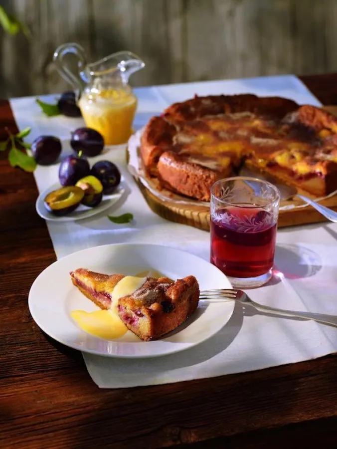 Rezept-Tipp: Versunkener Zwetschgenkuchen mit Zwetschgenwasser-Sabayon