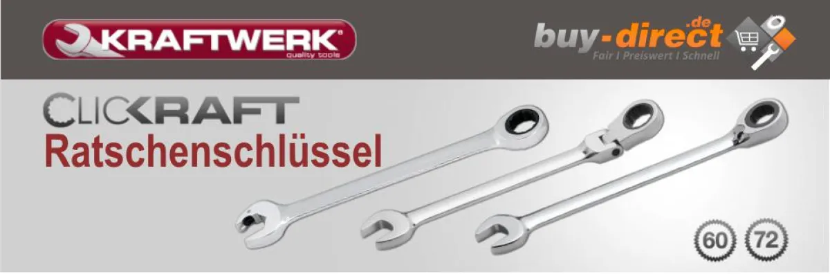 Erst kürzlich hat buy-direct im Rahmen einer Angebotserweiterung sämtliche Ausführungen der Original KRAFTWERK® Clickraft Ratschenschlüssel in den Shop aufgenommen. Der Ratschenschlüssel mit präzisionsgefertigtem Ringkern, kleinem Rückholwinkel und kompakter Bauform garantiert einen ruhigen und störungsfreien Lauf und ermöglicht das Arbeiten an sehr engen Stellen. Die hochwertigen Reversible Clickraft Ratschenschlüssel verfügen zudem über einen Umschalthebel und gewährleisten ein deutlich schnelleres Anziehen und Lösen von Schrauben – ideal für den professionellen Einsatz.
