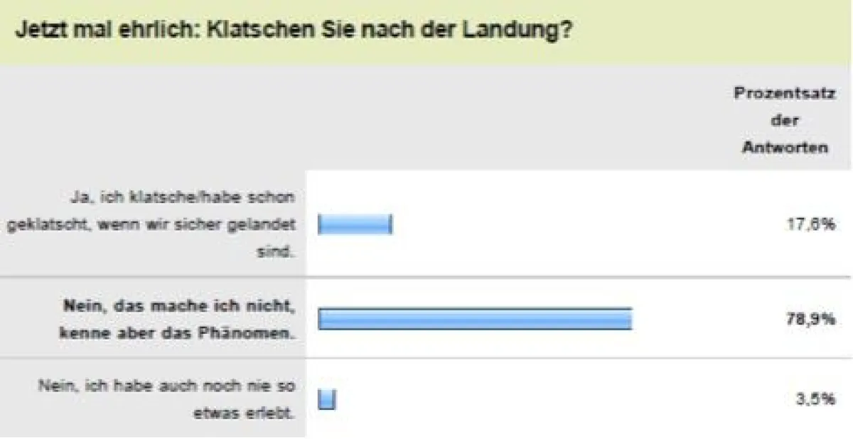 swoodoo.com 1.060 User befragt, was sie vom Lande-Applaus im Flugzeug halten. Das Ergebnis: Knapp 79 Prozent halten es für völlig überflüssig, dem Flugzeug-Kapitän ihre Anerkennung durch Klatschen zu zeigen. Etwa vier Prozent haben das Phänomen auch noch nie bei anderen Mitreisenden beobachtet. Dennoch finden sich unter den Befragten immerhin knapp 18 Prozent, die dem Piloten hin und wieder Applaus für eine geglückte Landung zollen oder dies zumindest schon einmal gemacht haben.