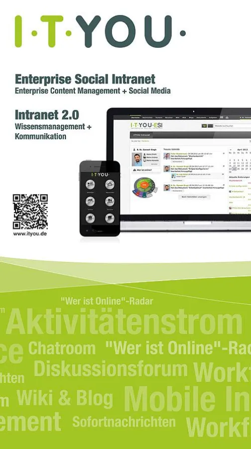 ITYOU greift diese Herausforderung auf und bietet eine neuartige Intranet-Lösung an, die weitreichende Kommunika­tions- und Kooperationsmöglichkeiten vorsieht. Instant Messaging, Aktivitätenstrom, "Wer-ist-online"-Radar, Chat-, Wiki- und Blog-Funktionen fördern die Kommunikation und das effiziente Zusammenarbeiten, vom Schreibtisch oder unterwegs mit mobilen Geräten.
