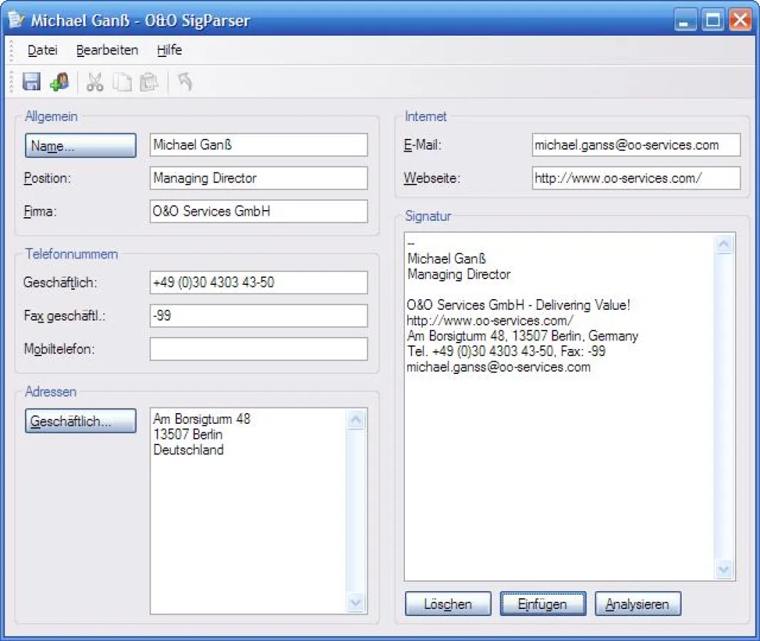 Klicken Sie im O&O SigParser auf die Schaltfläche Einfügen. Das Programm analysiert den Text in der Zwischenablage und ordnet die Kontaktdaten den entsprechenden Textfeldern zu.