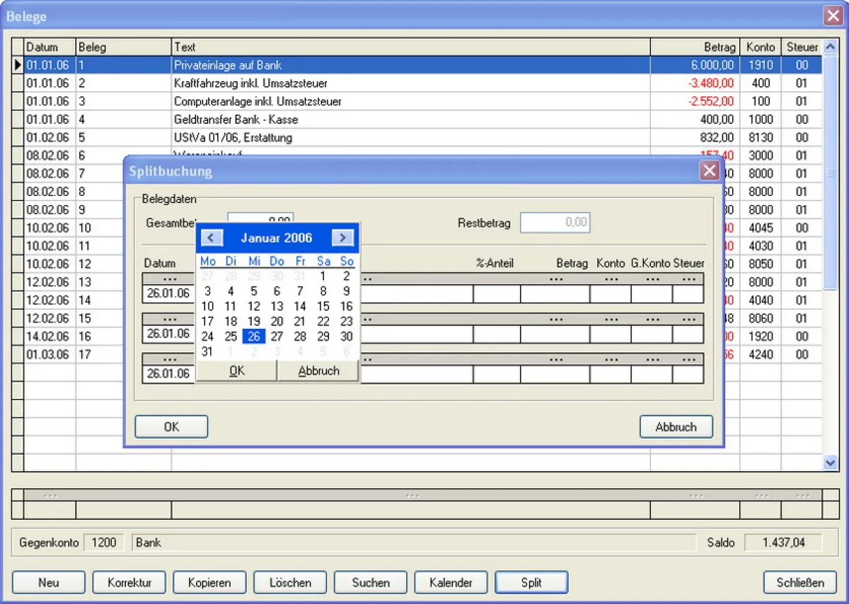 Buchungskalender: Der Buchungskalender verwaltet planmäßige Ein- und Mehrfachbuchungen – mit selektiver Übernahme in die Belegverwaltung.