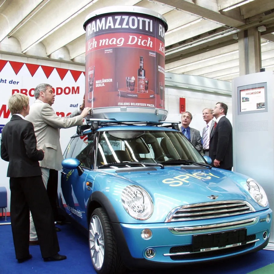 Der PROMODOM lehnt sich an die bewährte Litfasssäule an, allerdings mit dem feinen Unterschied, dass das Werbemedium in einem runden Container verstaut wird und auf jedes Autodach montiert werden kann.