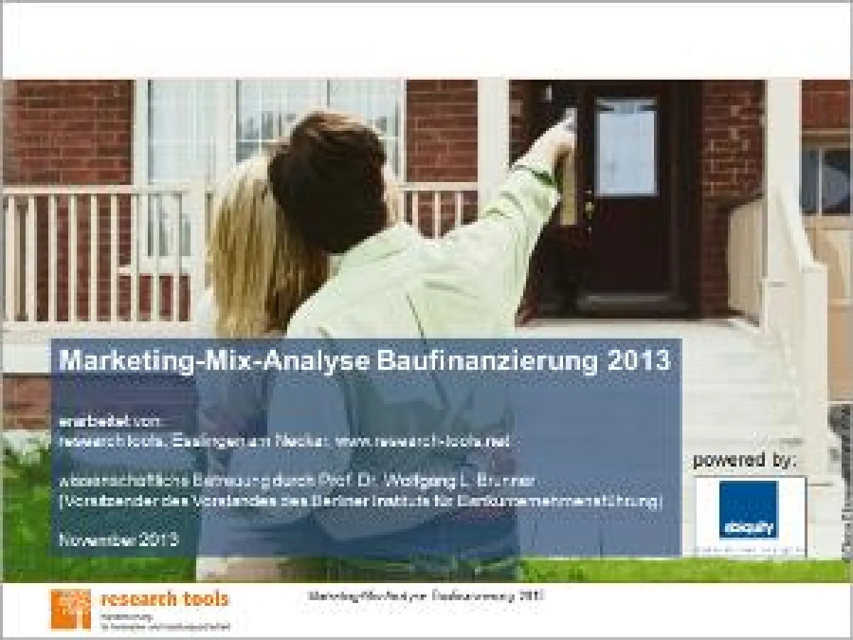 Die Studie "Marketing-Mix-Analyse Baufinanzierung 2013" von research tools gibt auf 559 Seiten Einblick in das Marketingverhalten der zehn berücksichtigten Baufinanzierer. Analysiert wurden die vier Marketing-Ps Product, Price, Place, Promotion zwischen Juli 2012 und Juni 2013. Die dazugehörigen Marktinformationen stammen aus Online-Datenbanken, verschiedenen Sekundärquellen, eigenen Erhebungen und Mystery Research. Eine Stärken-Schwächen-Analyse und ein Marketing-Ranking runden die Studie ab.