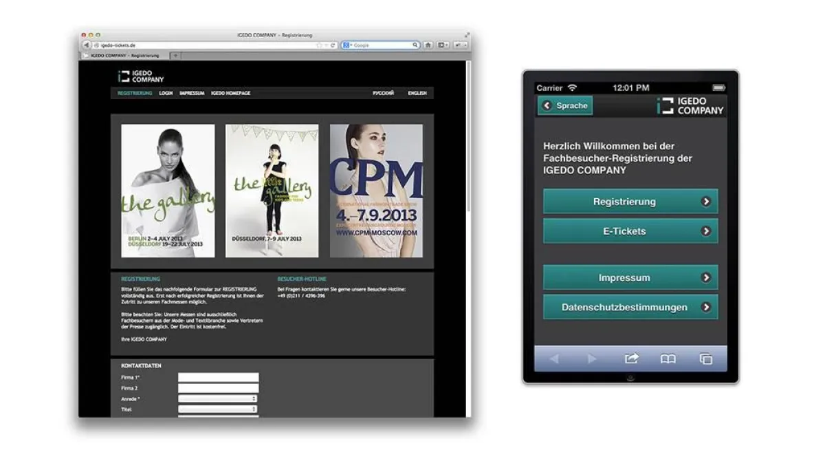 Mit dem neuen System können die Besucher der Igedo-Veranstaltungen nach einmaliger Registrierung nun ihre Tickets online ordern. Sie lassen sich als PDF ausdrucken oder mit dem Smartphone vorzeigen. Bis zum erfolgreichen Start des Systems vor kurzem in Moskau hatte das Team von Jahns and Friends eine ganze Reihe von Herausforderungen zu meistern. Dabei stellten die Anpassung des Designs an die CI-Vorschriften der Igedo und die Lauffähigkeit auf unterschiedlichen Endgeräten bis hin zur mobilen Anwendung noch die kleinsten Hürden dar.