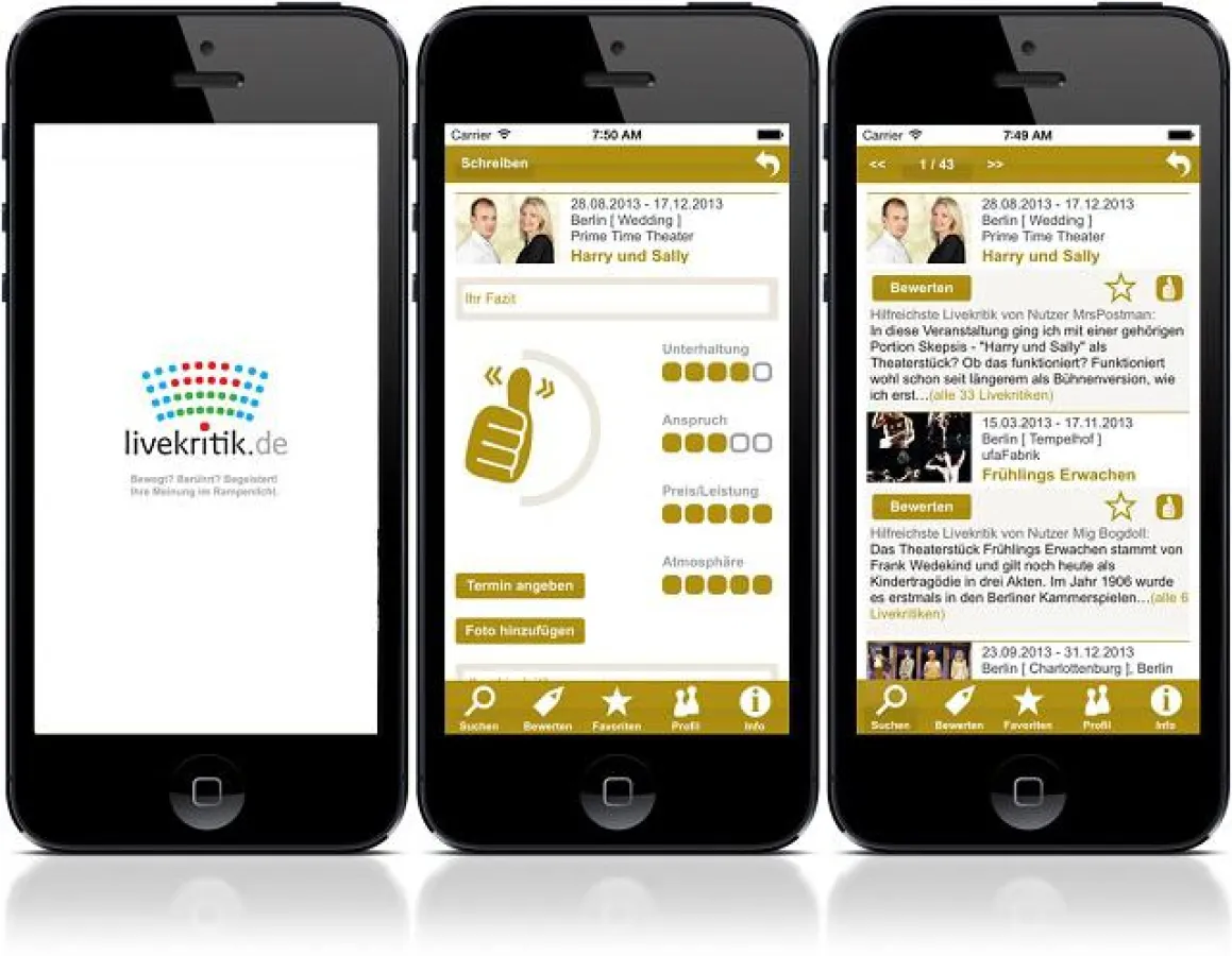 Als Entscheidungshilfe über den nächsten Kulturbesuch und als soziale Plattform für Kulturkritik ist die livekritik-App eine praktische Begleitung für unterwegs. Ein kostenloser Service für alle Kulturinteressierten, der die Kommunikation zwischen Besucher und Veranstalter noch direkter gestaltet, dem Einzelnen nun auch unterwegs eine Stimme gibt und den Kulturdiskurs demokratisiert.