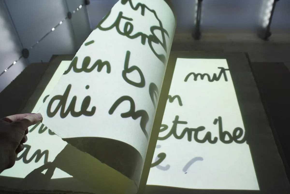 Seine Seiten füllen sich durch Filmprojektionen mit Texten zum Thema Papier. „Das digitale Medium ist damit plötzlich wieder greifbar“, erklärt Ueberholz-Designer André Füsser, „aber nur scheinbar, denn geschrieben wird ja mit Licht!“ Beschriftete Schuhskulpturen aus Papier und Schreibtafeln runden die Text-Bild-Konstellation künstlerisch ab. Über allem liegt unterdessen ein eigens von Experimentalmusiker Olaf Pyras komponierter Klangteppich, den ein siebenköpfiges Orchester mit Hilfe von besagten 14 leeren Brötchentüten erzeugt.