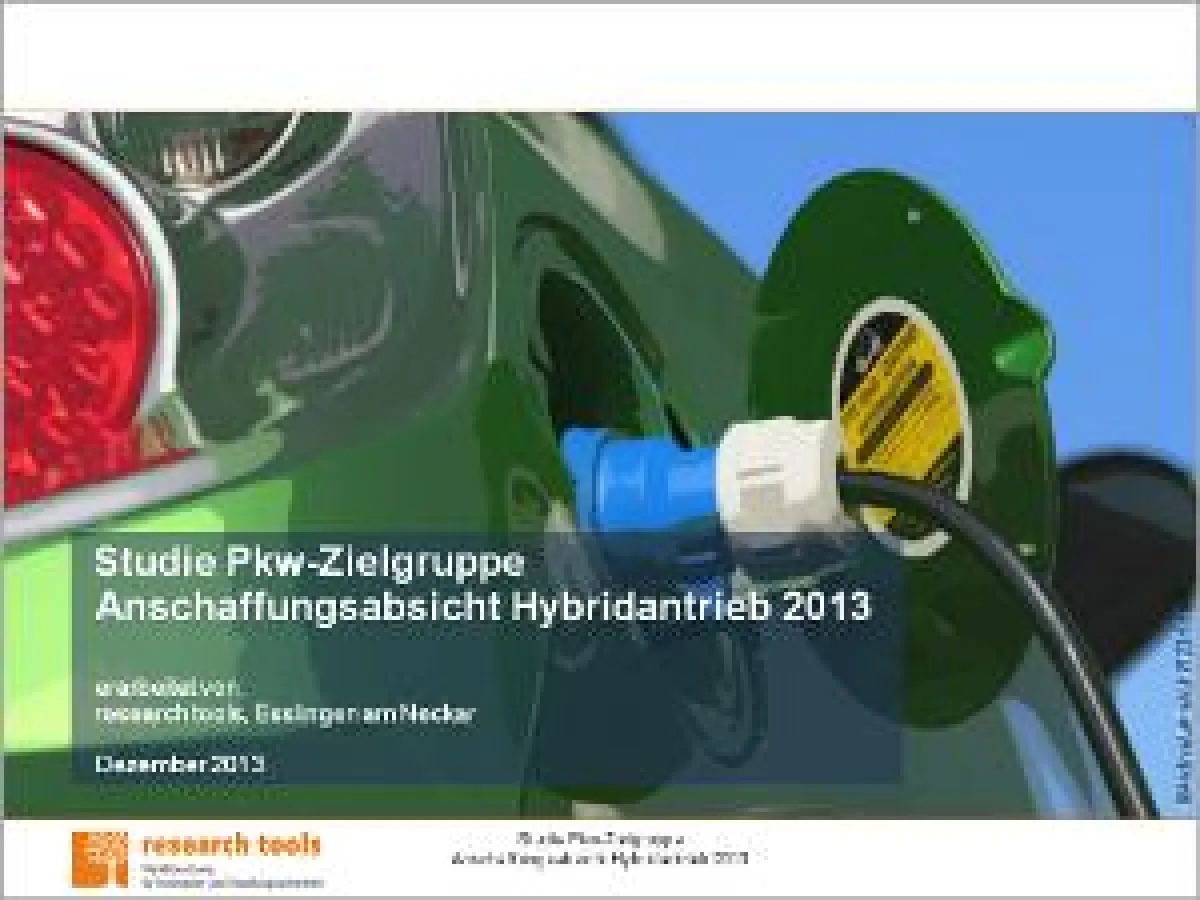 Die Studie „Pkw-Zielgruppe Anschaffungsabsicht Hybridantrieb 2013“ von research tools gibt auf 88 Seiten Einblick in das Verhalten der Zielgruppe. Basis sind über 32.000 Interviews mit bevölkerungsrepräsentativ ausgewählten Personen, davon rund 3.600 aus der betrachteten Zielgruppe. Neben Soziodemografie, Konsumeinstellungen und dem Kundenverhalten im Automobilmarkt wird das Freizeit- und Medienverhalten der Zielgruppe untersucht.
