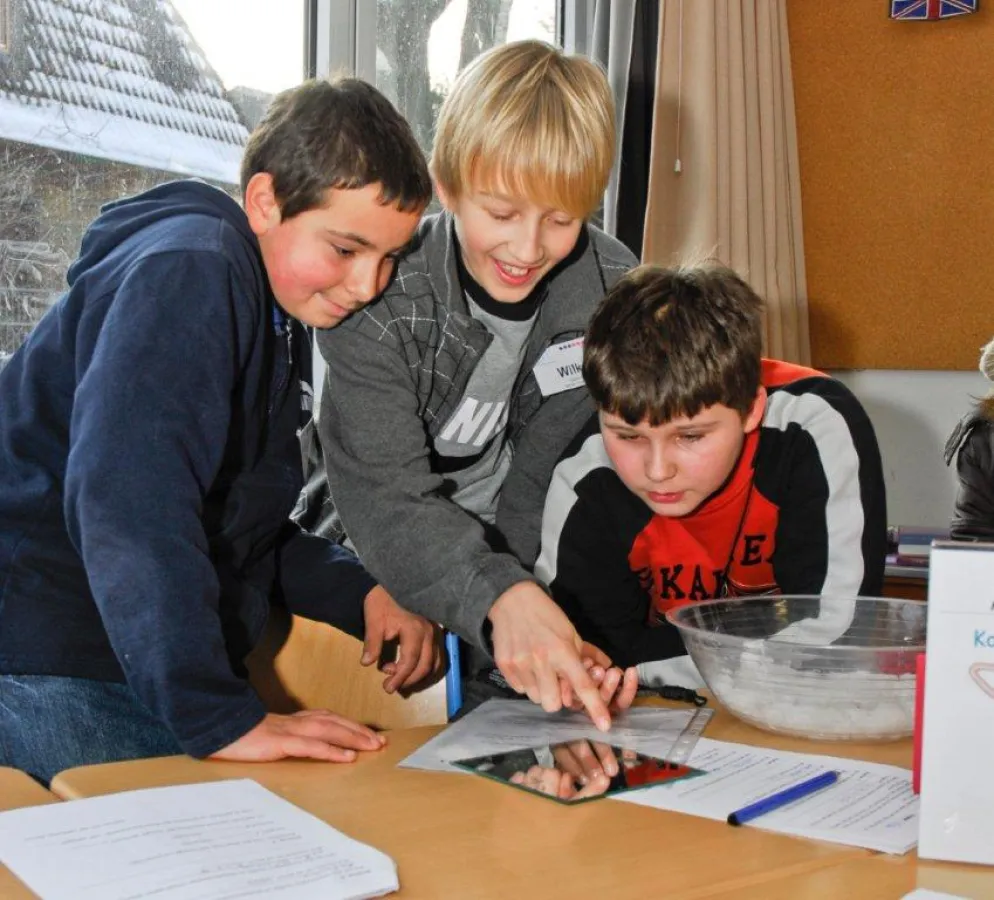 Insgesamt fünf verschiedene Versuche rund um das Wetter im Zimmer macht jede der Forschergruppen. Und weil das alles gleichzeitig und parallel läuft, finden sich überall im Hause Forschergruppen mit Messgeräten bewaffnet. Mit einem Luftfeuchtemessgerät sind sie auf der Suche nach den trockensten und feuchtesten Stellen im Raum. Eine andere Gruppe hantiert mit Spiegel und Haartrockner. Hier geht es um das Phänomen Kondensation, das jeder von seinem Badezimmerspiegel kennt. Auch der Kohlenstoffdioxidgehalt in der Zimmerluft wird untersucht. Und um den steht es gar nicht gut. In diesem Fall liegt das aber ausnahmsweise mal nicht am Klimawandel, sondern einfach daran, dass hier viele Menschen sich wenig Luft teilen und bis jetzt noch niemand das Fenster geöffnet hat.