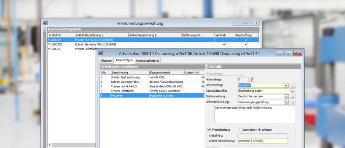 Mit der Bestellung ist die externe Bearbeitung auch vollständig im Beschaffungsprozess integriert. Die Vollintegration der Fremdleistung in die PPS-/ERP-Software ermöglicht gleichzeitig eine schlüssige Rückverfolgung aller ausgelagerten Prozessschritte auf einzelne Fertigungsaufträge.