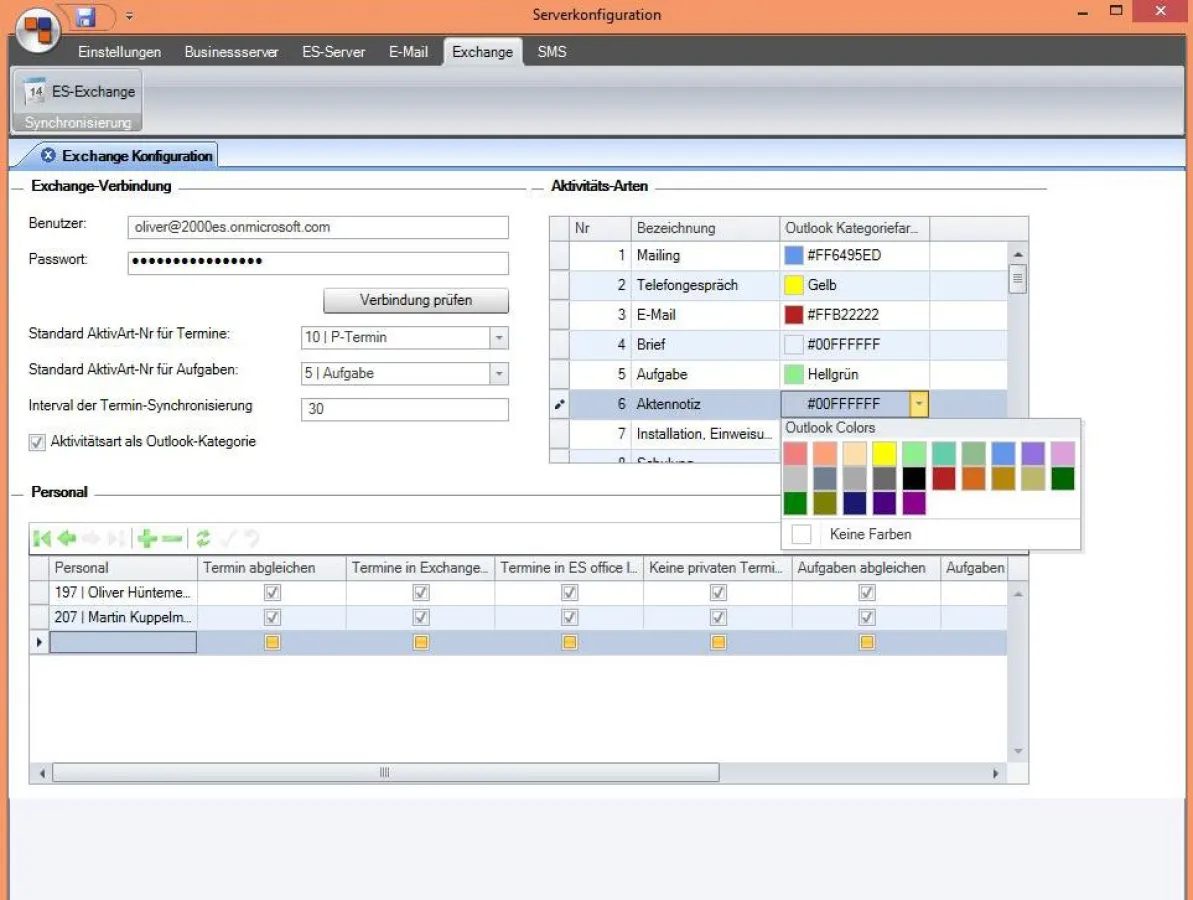 Die Installation und Konfiguration der Schnittstelle ist weniger aufwändig als bisher. Durch die Active-Directory-Integration müssen nur noch Benutzername, Passwort und Exchange-URL eingegeben werden. Dadurch lassen sich auch mehrere Exchange-Instanzen mit einer ES office-Datenbank synchronisieren. Das ES 2000-Team setzt auf eine Webservice-API, wodurch die Kompatibilität erhöht wird und mehr Funktionalität möglich ist. So können z. B. die Outlook-Kategorien den ES office-Aktivitätsarten zugeordnet werden.