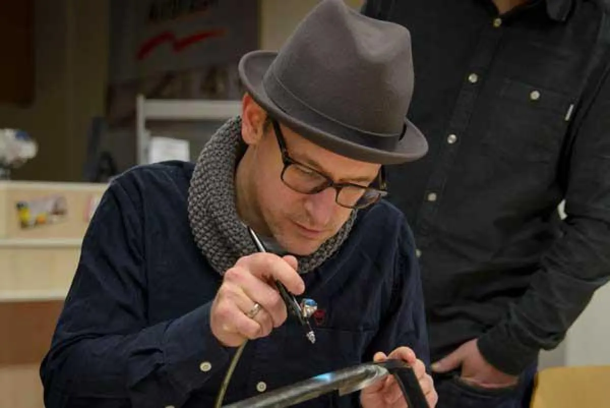 Seit Jahren arbeitet das Airbrush-Team Hamburg dabei mit den Geräten des Norderstedter Airbrush-Herstellers Harder & Steenbeck, einem der weltweit führenden Anbieter dieses vielseitigen Malwerkzeugs. Aufgrund des „Heimvorteils“ lag der Gedanke nahe, die offizielle Übergabe der Bikes in Norderstedt zu organisieren, wo die Band zum ersten Mal in ihrem Leben selbst ein Airbrush-Gerät zur Hand nahm. „Die drei haben Talent“, sagt Marketing-Leiterin Kerstin Stoltenberg von Harder & Steenbeck. „Wer zum ersten Mal mit einem Airbrush-Gerät sprüht, hat oftmals Schwierigkeiten damit, gleichzeitig die Luft- und Farbzufuhr zu bedienen und dann auch noch richtig zu zielen, ohne den Untergrund zu berühren. Bei den Jungs klappte das auf Anhieb super.“ Nach ersten Übungen auf Papier trauten sie sich sogar, ein mit Klebeband maskiertes Logo direkt auf dem Fahrrad zu gestalten. Für ihre Unterschriften griffen Dokter Renz, König Boris und Björn Beton dann doch lieber wieder zum vertrauten Marker. Zum Schluss wurden die Kunstwerke noch mit einer dicken Schicht Klarlack vollendet, um sie widerstandsfähig für den täglichen Gebrauch zu machen.