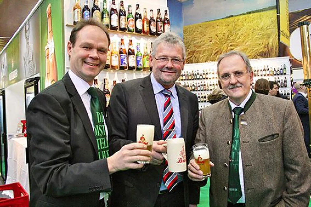 Bildunterschrift (v.l.n.r.): Gemeinsam auf der Grünen Woche: Achim Kalweit (Geschäftsführer Distelhäuser Brauerei), Alois Gerig (MdB, Obmann der CDU/CSU-Fraktion im Ausschuss für Ernährung, Landwirtschaft und Verbraucherschutz) und Roland Andre (Geschäftsführer Distelhäuser Brauerei).