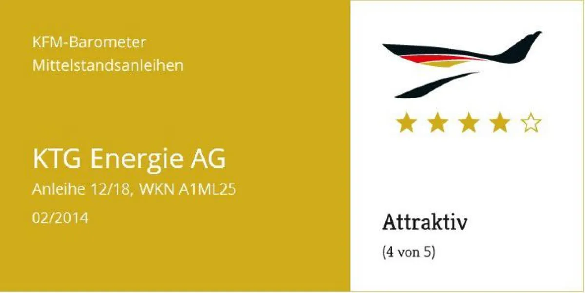 Düsseldorf, 03. Februar 2014 - In ihrem aktuellen Mittelstandsanleihen-Barometer zu der KTG Energie-Anleihe (A1ML25) kommt die KFM Deutsche Mittelstand AG zu dem Ergebnis, die Anleihe weiterhin mit „attraktiv“ einzustufen. Die KTG Energie AG überzeugt im Rumpfgeschäftsjahr 2013 mit einem Umsatzplus von 117% und einer Steigerung des operativen Ergebnisses von 95% bei einer gleichzeitig attraktiven Rendite von 8,14% p.a. bei der Mittelstandsanleihe.