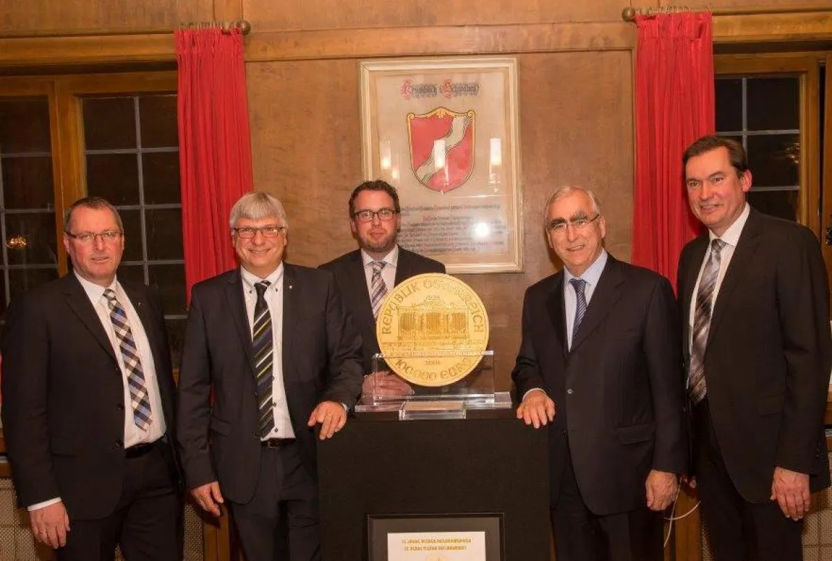 Im Jahr 2004, zum 15-jährigen Jubiläum der Anlagemünze „Wiener Philharmoniker“, gab die Münze Österreich, eine Tochtergesellschaft der österreichischen Nationalbank, eine 1.000-Unzen-Version der Anlagemünze heraus. Eine Münze dieser Dimension kann nicht mehr geprägt, sie muss gegossen und anschließend von Hand bearbeitet werden. Weltweit gibt es von der „BIG PHIL“ genannten Münze lediglich 15 Stück. 13 Exemplare gingen damals an Käufer in aller Welt, eine befindet sich im Münzmuseum der Österreichischen Nationalbank in Wien und eine weitere ist im Besitz des Goldhandelshauses pro aurum in München. Bisher wurde diese besondere Münze nur in Metropolen wie Frankfurt, Düsseldorf oder Dresden präsentiert, diesmal war die Kleinstadt Krumbach im Herzen Mittelschwabens an der Reihe. Möglich wurde dies nur, weil die Krumbacher Vermögensverwaltung Glogger & Rogg „Premiumpartner“ des Münchner Goldhauses pro aurum ist. Unser ehemaliger Bundesfinanzminister Dr. Theo Waigel durfte den „BIG PHIL“ im Jahr 2004 im Rahmen einer Galaveranstaltung im Prinzregententheater München feierlich enthüllen. Zehn Jahre nach der feierlichen Enthüllung kam es nun in der Heimat von Dr. Waigel zur „Wiedervereinigung“. Mit der Präsentation des „BIG PHIL“ – Europas größter Goldmünze wurde Krumbach für einen Abend zur „goldenen Mitte“ Schwabens, wie es Dr. Waigel als Hauptredner dieses beeindruckenden Abends formulierte.
