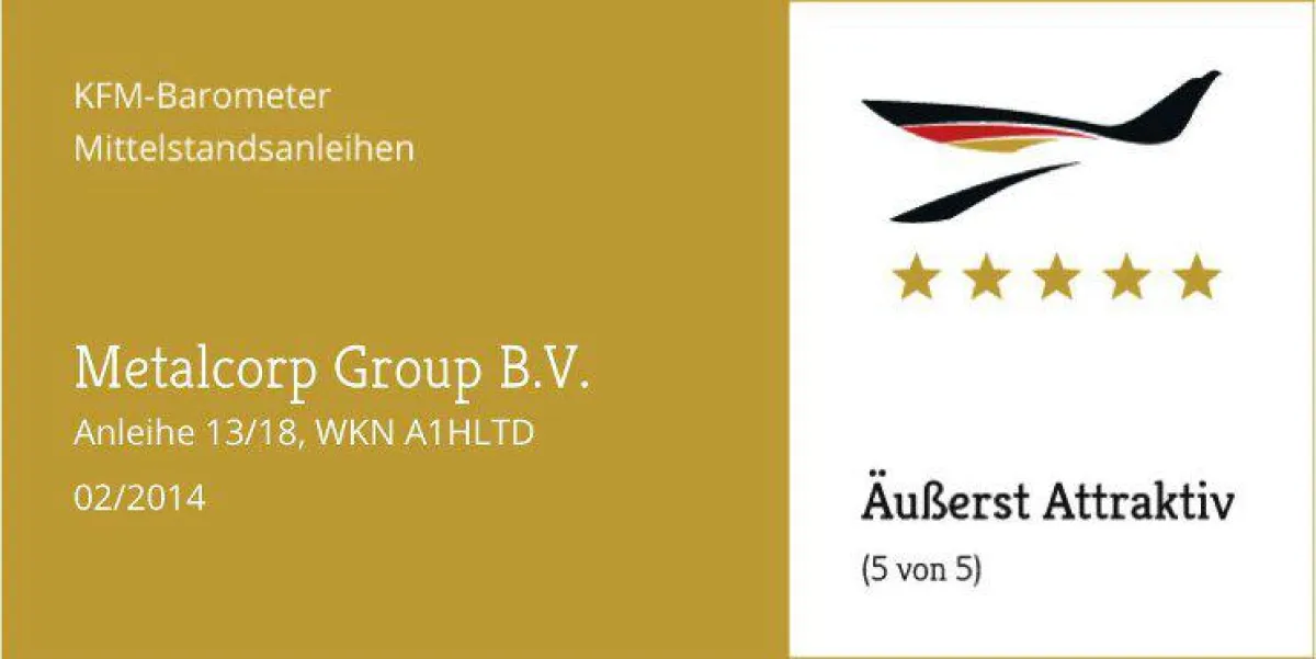 Düsseldorf, 05. Februar 2014 - In ihrem aktuellen Mittelstandsanleihen-Barometer zu der Metalcorp-Anleihe (A1HLTD) kommt die KFM Deutsche Mittelstand AG zu dem Ergebnis, die Anleihe auf „äußerst attraktiv“ einzustufen.