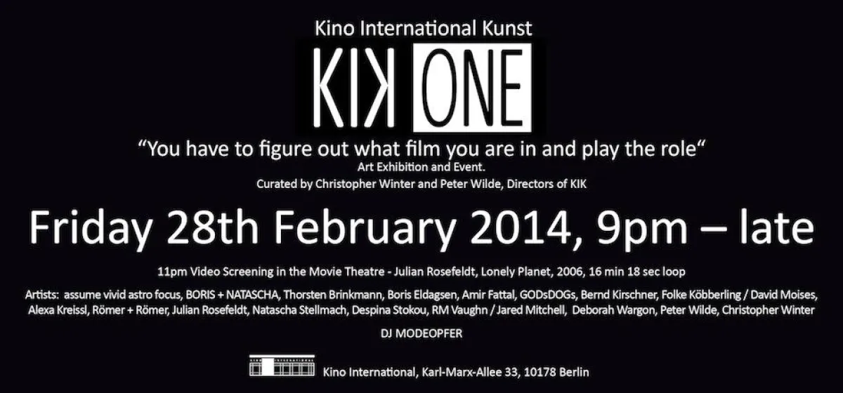 Die erste Ausstellung „KIK-ONE“ findet am Freitag, den 28.02.2014 statt und fuhrt den Untertitel “You have to figure out what film you are in and play the role“. „Zum Start der Ausstellungsreihe „KIK“ haben wir uns bewusst für ein offenes Thema entschieden, um den offenen Rahmen des Events zu unterstreichen.“ erklärt „KIK“-Direktor Christopher Winter, der die Ausstellungen gemeinsam mit Peter Wilde kuratiert hat.