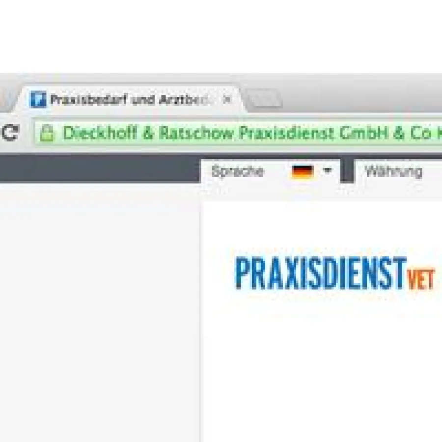 Der grüne Hintergrund der Adresszeile stellt für den Kunden gut sichtbar klar, dass er sich nun in einem gesicherten Bereich des Onlineshops Praxisdienst-VET befindet. Durch Klick auf den grünen Firmennamen gelangt er zu weiteren Informationen und der Authentifizierung von Praxisdienst-VET.