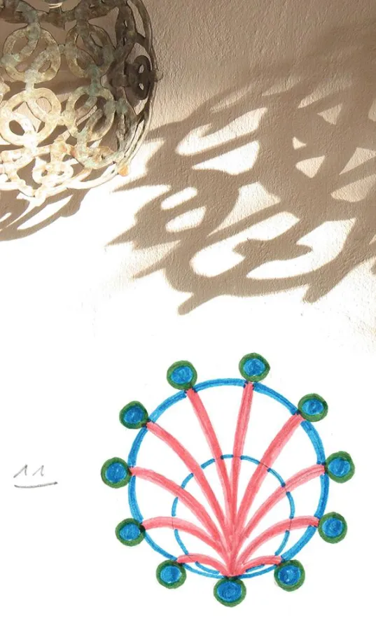 Zentraler Aspekt der ersten Ausstellung zum Jahresthema 2014 »11« ist die Zahlenmystik in Martina Schoders keramischen Arbeiten. Die aus streifenförmigen Material erarbeiteten Tonarbeiten in Form von Rosetten erinnern an die zugrundeliegenden Zeichnungen und folgen stets einem gewünschten Formprinzip. Jede neue Rosette ist eine konzentrierte, meditative Arbeit. Beim Glasieren und mit farbigen Engoben wird nur die Vorderseite überzogen. Ausführliche Zeichnungen entstehen vor, aber auch nach dem frischen Bau und dem Brand der Tonformen. Jede Rosette ist ein Unikat. Martina Schoder schafft für die Ausstellung neue Rosetten bis zur Elf-Zahl, die jede Zahl individuell widerspiegeln, begleitet von farbigen Zeichnungen, dem Blütenregen.