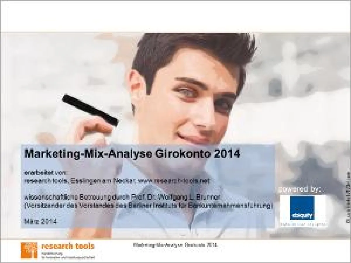 Die Studie "Marketing-Mix-Analyse Girokonto 2014" von research tools gibt auf 504 Seiten Einblick in das Marketingverhalten der zehn berücksichtigten Banken comdirect, Commerzbank, Cortal Consors, DAB, DKB, ING-DiBa, Postbank, Sparkassen, Targobank und VR-Banken. Analysiert wurden die vier Marketing-Ps Product, Price, Place, Promotion im Girokontomarkt von Dezember 2012 bis November 2013. Die dazugehörigen Marktinformationen stammen aus Online-Datenbanken, verschiedenen Sekundärquellen, eigenen Erhebungen und Mystery Research. Stärken-Schwächen-Analysen, Marketing-Ranking und Marketing-Similarity-Analyse führen sämtliche Ergebnisse zusammen.
