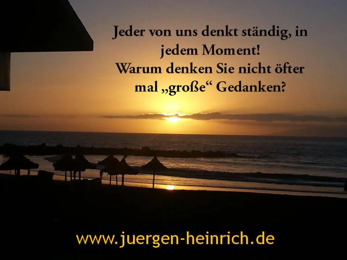 Deshalb empfiehlt der Coach sich immer wieder mit seinen Wünschen und Zielen zu beschäftigen. "Die meisten Menschen beschäftigen sich den ganzen Tag lang eher mit Problemen, Streitgesprächen oder mit negativen Nachrichten als mit Ihren Zielen", so Jürgen Heinrich. Ganzheitlicher (Lebens-)Erfolg lässt sich jedoch viel einfacher, leichter und mit mehr Spaß und Freude erreichen, wenn wir öfter von unseren Zielen sprechen und uns diese vor unserem geistigen Auge möglichst realitätsnah vorstellen.