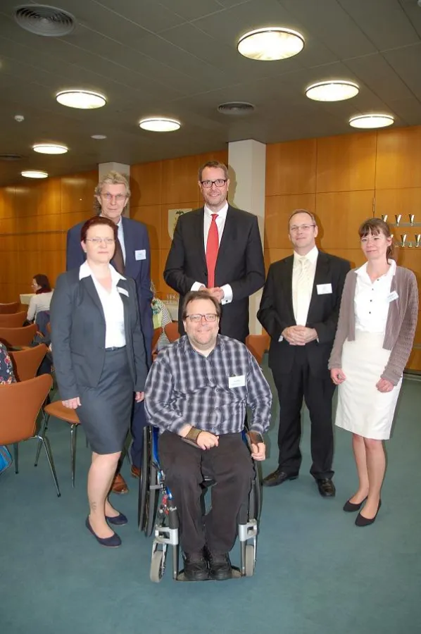 Info zum Bild: (v.li.n.re): Tina Poklitar (Leiterin des MeH-Kompetenzzentrums Mitte der FAW), Horst Maus (Leiter Beschäftigungs- und Arbeitsmarktförderung der Landeshauptstadt Mainz), Minister Alexander Schweitzer (Minister für Soziales, Arbeit, Gesundheit und Demografie von Rheinland-Pfalz), Johann Schmidt (Akademieleiter FAW Mainz), Tanja Karten (Regionalbereichsleiterin Mitte/Nord der FAW und Mitglied der Geschäftsleitung), vorne: Matthias Rösch (rheinland-pfälzischer Landesbeauftragter für die Belange behinderter Menschen).