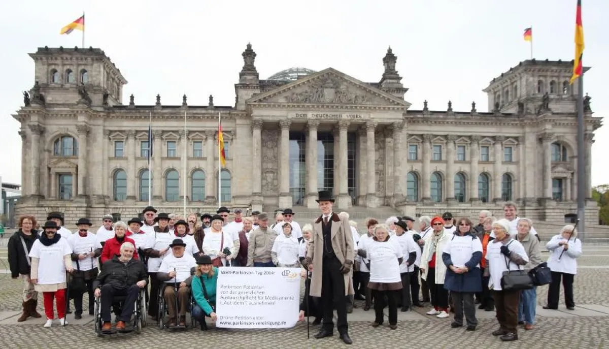 sich vor dem Reichstag in Berlin versammelt. Zum Welt-Parkinson-Tag haben sie darauf aufmerksam