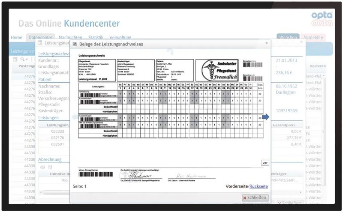 Flexibel sind Pflegedienste auch mit dem Online Kundencenter der opta data Gruppe, das sie zusätzlich kostenlos zur Abrechnung erhalten. Denn so können sie sich jederzeit von jedem Ort aus online einen umfangreichen Überblick über ihre Abrechnungsvorgänge verschaffen: Rechnungskorrekturen und Patientenstammdaten einsehen oder Leistungsnachweise, Genehmigungen sowie Statistiken abrufen.