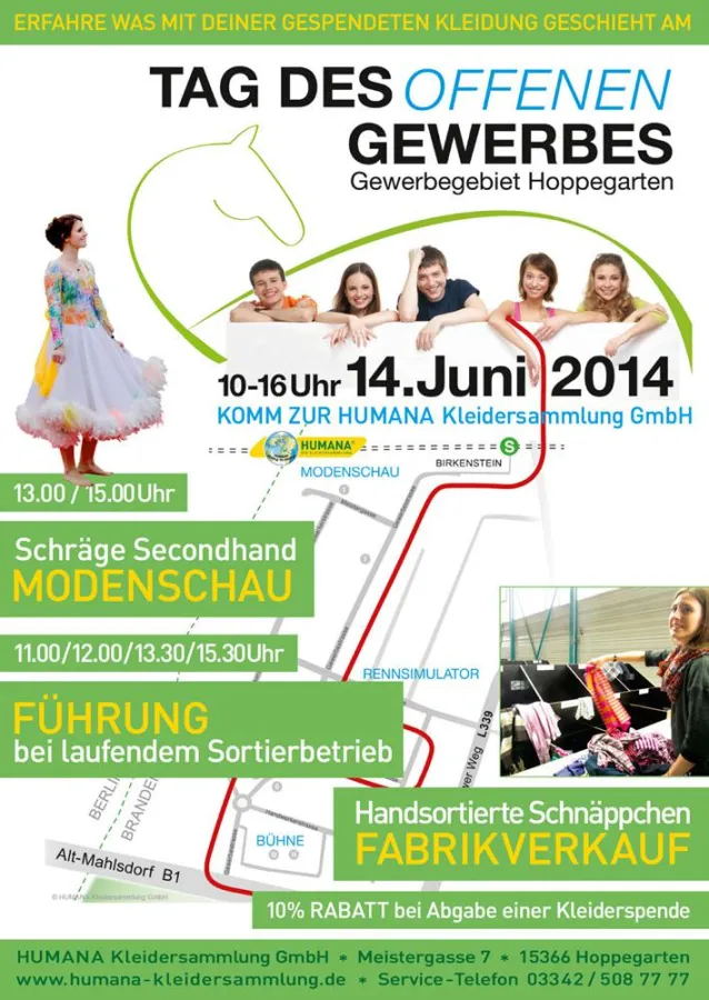 (openPR) Zusammen mit elf weiteren Firmen lädt HUMANA Kleidersammlung GmbH am 14. Juni 2014 von 10 bis 16 Uhr zum Tag des offenen Gewerbes im Gewerbegebiet Hoppegarten direkt bei Berlin ein. Für alle Besucher bietet sich die einmalige Gelegenheit, hinter die Kulissen zu schauen, um zu erfahren, was mit den HUMANA-Kleiderspenden passiert. Die vier Betriebsführungen durch die Sortierhalle (11, 12, 13.30 und 15.30 Uhr) geben einen faszinierenden Einblick in die Welt des Altkleidervertriebs. Höhepunkte bei HUMANA Kleidersammlung GmbH sind die Modenschau um 13 und 15 Uhr sowie der Fabrikverkauf mit Second-Hand-Mode direkt aus der Sortierhalle (10% Rabatt bei Abgabe einer Kleiderspende). Besucher können während der gesamten Veranstaltungszeit das Gewerbegebiet Hoppegarten bequem mit dem Busshuttle erkunden.