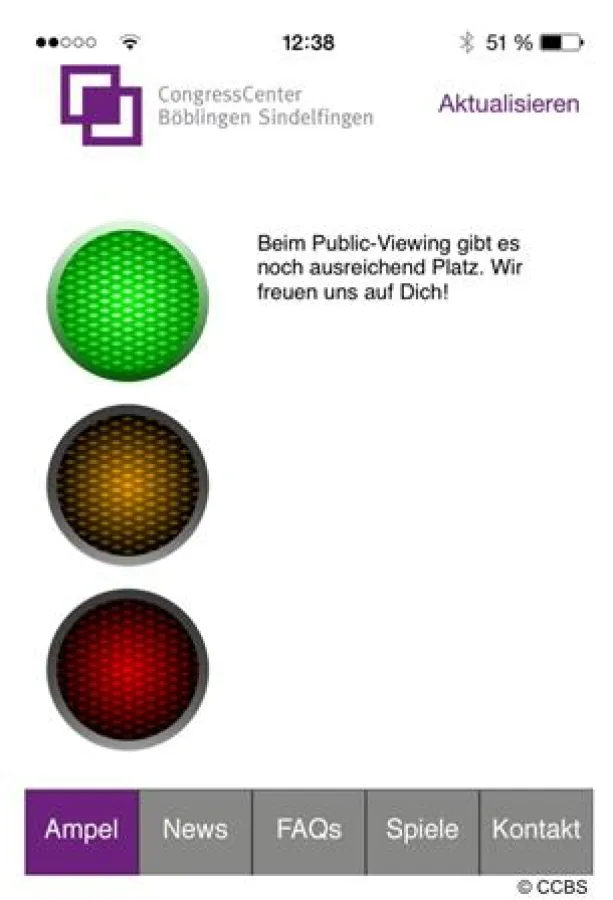 (openPR) Seit dem 12. Juni begeistert das Public-Viewing auf dem Sindelfinger Wettbachplatz zahlreiche Fußball-Fans. Die kostenfreie und eigens programmierte „Public-Viewing Sindelfingen“- App informiert dank genialer Ampelfunktion über den aktuellen Besucherstand.