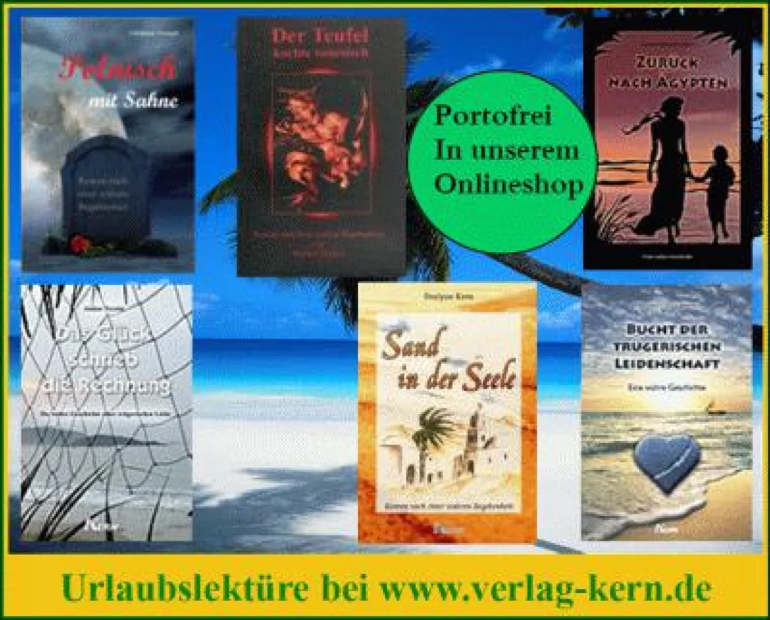 Evelyne Kern wurde mit ihrem Bestseller „Sand in der Seele“ bereits durch zahlreiche Fernsehsendungen (wie MonaLisa, SAT1-Akte, CosmosTV, FrauTV u.v.m.) und viele Zeitungsartikel bekannt. Auch die von ihr gegründete Internetseite 1001Geschichte.de, die inzwischen zur größten Plattform Europas zum Thema „Bezness“ wurde, und aus der der eingetragene Verein www.CIBev.de hervorging, trägt zu ihrem wachsenden Bekanntheitsgrad bei und prägt das Bewusstsein für das Phänomen „Bezness“. Sand in der Seele ist die tragische Geschichte einer deutschen Journalistin, die glaubt, in Tunesien das große Glück gefunden zu haben, aber am Ende nicht nur ihr gesamtes Vermögen verliert, sondern auch vergeblich um ihre Rechte in einem frauenfeindlichen Land kämpft. Aus purer Angst, zutiefst verletzt und gedemütigt, muss sie schließlich ihr Traumhaus verlassen und ein harter Kampf gegen einen riesigen arabischen Familienclan beginnt.... ISBN 978-3-939478-04