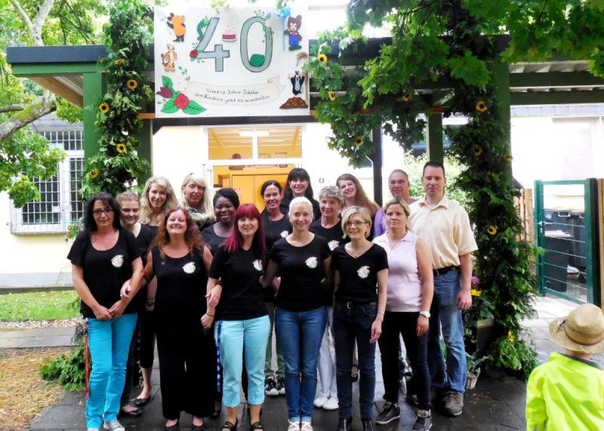 Unter den Jubiläumsgästen waren auch Vize-Bürgermeister Rudolf Eich, der zuständige Dezernent, Erster Beigeordneter Heinz Eschbach, und Jugendamtsleiter Dr. Markus Wüst. Sie alle freuten sich über den liebevoll gestalteten Türkranz zum 40. Geburtstag der Kindertageseinrichtung, den der Elternrat gestaltet hatte. Zu den Überraschungen gehörten zudem eine überdimensionale Geburtstagstorte und der Besuch der Tiere vom Abenteuerspielplatz FWH.