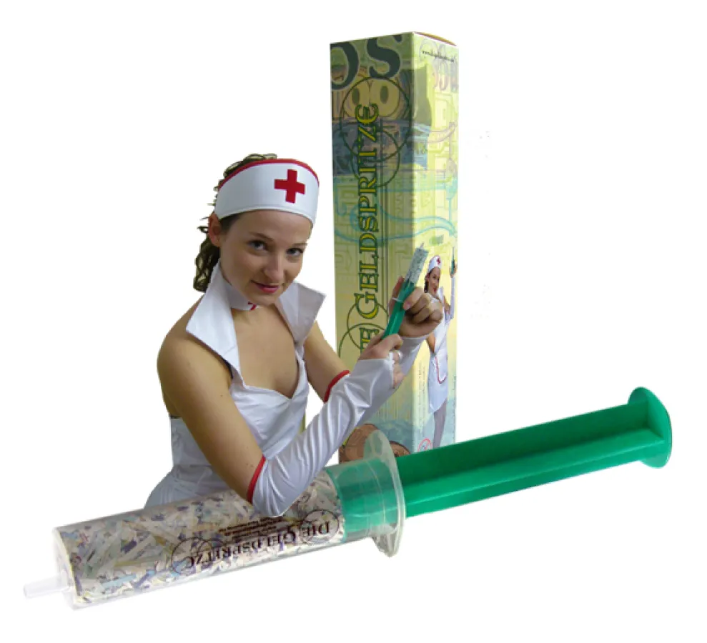 Auch die ersten Unternehmen der Finanzbranche haben dieses Produkt als ideales Mitbringsel für sich und ihre Kunden entdeckt. Der persönliche Kontakt ist sehr wichtig, ein erfolgreicher Berater muss Vertrauen und Charme ausstrahlen. Im Gefecht um Abschlüsse und Investoren kann ein witziges und außergewöhnliches give away das Zünglein an der Waage sein. Beschenkten Mitmenschen sollte allerdings keine Hoffnung auf den schnellen Reichtum gemacht werden. Der geneigte Sparer könnte sich eventuell ernsthaft überlegen, ob er seinen Jahresurlaub opfern sollte, um in mühevoller Kleinarbeit die sortenreinen, zerkleinerten Banknoten in der Spritze wieder zusammenbasteln. Informationen finden Sie auf der Homepage des Herstellers unter www.diegeldspritze.de .