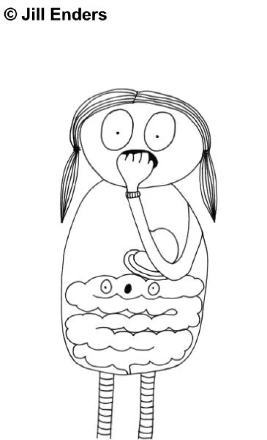 Ohne Hemmungen und in beinahe liebenswerter Fäkalsprache erklärt sie alles über die Geheimnisse des Darms und seine organischen Abläufe. Zum Beispiel, dass die meisten Menschen völlig falsch auf der Toilette sitzen. Das kann nicht nur zu Verstopfung führen, sondern im schlimmsten Fall sogar zur Stuhlgangohnmacht oder Herzinfarkt. Auch das Häufchen wird genauer von Enders unter die Lupe genommen. Von Festigkeit bis zur Konsistenz lässt sie nichts unversucht, dem Leser diesen natürlichen Vorgang näher zu bringen. Und auch unangenehme Themen wie Parasiten werden von ihr mit fröhlicher Gelassenheit genauestens beschrieben. Den Madenwurm, von ihr auch liebevoll „Arschkriecher“ genannt, kann zum Beispiel sogar beobachtet werden. Denn hin und wieder streckt er sein Köpfchen aus dem Anus. Keine Panik, wer Madenwürmer hat, dem kann der Arzt sofort helfen. Zuvor der Test: „Pobacken auseinanderspreizen. Tesa auf und um den Anus kleben und dann abziehen. In die Praxis bringen. Und Janine der Sprechstundenhilfe geben. Tschüss!“