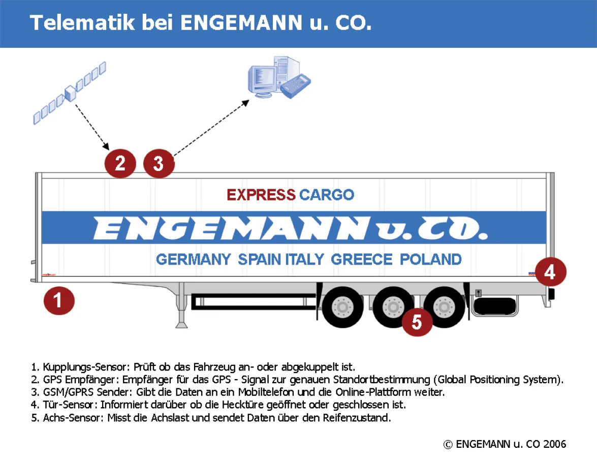 (openPR) Am 14.03.2006 hat die Firma ENGEMANN u. CO. int. Spedition den Kauf der ersten mit einem Telematik System von „CARGOBULL Telematics“ ausgerüsteten Trailer besiegelt. Anders als in vielen anderen Systemen ist diese Variante unabhängig vom Zugfahrzeug einsetzbar. D.h. das System wird nicht in der Zugmaschine verbaut, sondern da wo sich die Ladung befindet, direkt im Sattelauflieger.