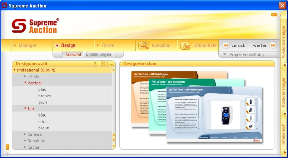 Supreme Auction hilft allen Verkäufern, eine wirklich professionell gestaltete Seite ins Netz zu stellen, die mit animierten Elementen, einer Foto-Slideshow und mehreren Unterseiten mit weiterführenden Informationen aufwarten kann. Das Gestaltungsprogramm arbeitet dabei vollständig webgestützt, ist also Web-2.0-kompatibel und demnach von jedem Ort der Welt aus leicht zu nutzen.