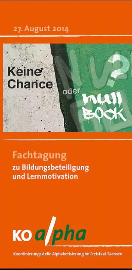 Woran liegt es, wenn Bildungsangebote nicht wahrge-nommen werden, wenn Menschen die Schule ohne Ab-schluss verlassen oder gar als funktionale Analphabeten durchs Leben gehen? Ist es die „Null Bock“-Mentalität, die man dann gern unterstellt oder haben diese Menschen keine echte Chance, sich an Bildung zu beteiligen? Diese Fragen möchte die Koordinierungsstelle Alphabetisierung im Freistaat Sachsen koalpha am 27. August 2014 zu ihrer Fachtagung mit den Teilnehmern diskutieren.