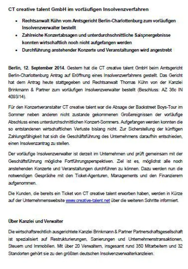 Für den Konzertveranstalter CT creative talent war die Absage der Backstreet Boys-Tour im Sommer neben anderen nicht zustande gekommenen Großereignissen der vorläufige Abschluss eines unterdurchschnittlichen Konzert-Sommers. Aufgefangen werden konnten die so entstandenen wirtschaftlichen Verluste bislang nicht. Zur Sicherstellung der künftigen Zahlungsfähigkeit hat sich die Geschäftsführung des Unternehmens daraufhin entschieden, einen Insolvenzantrag zu stellen.