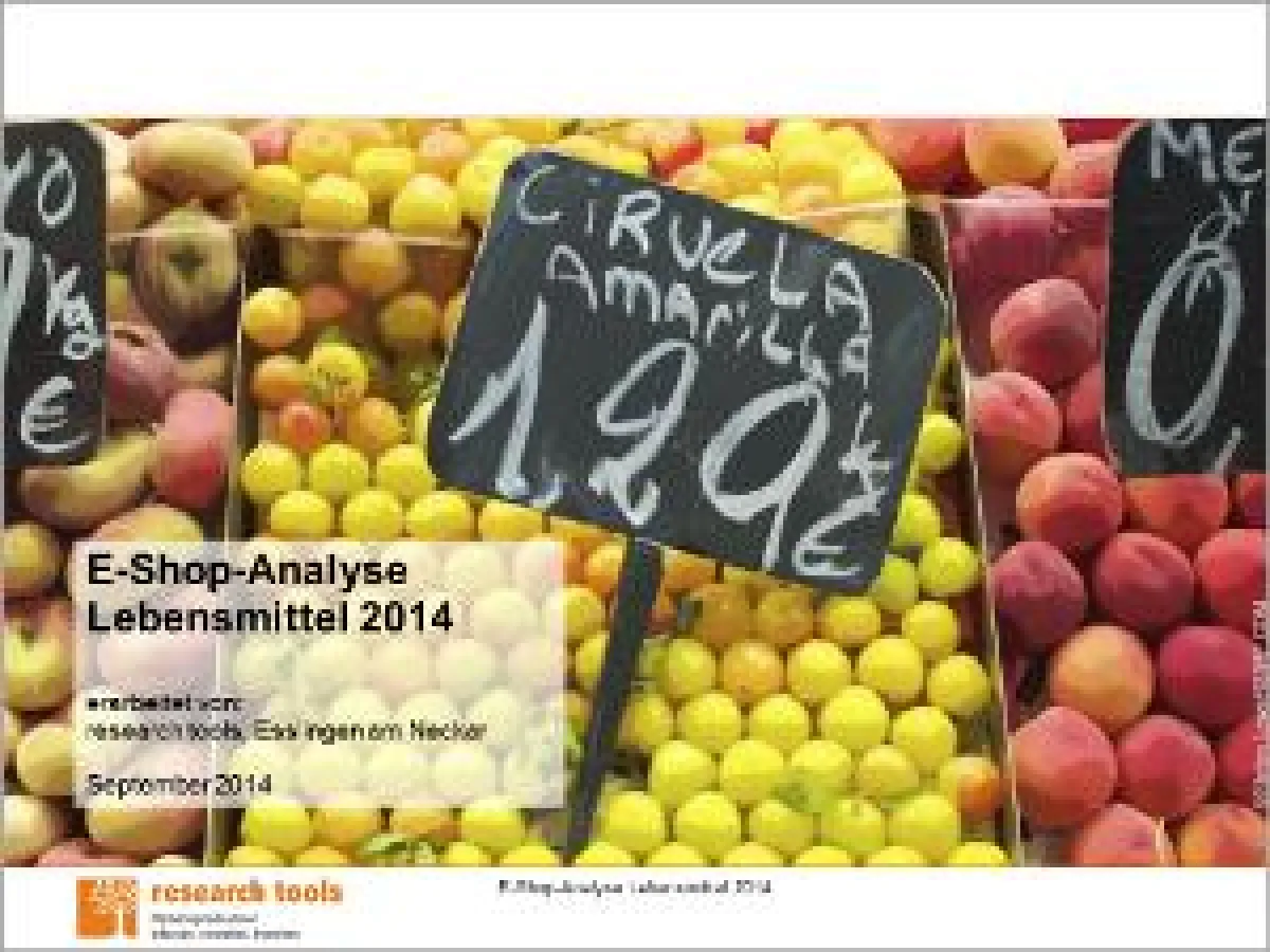 Die Studie „E-Shop-Analyse Lebensmittel 2014“ von research tools untersucht auf 146 Seiten die E-Shops zehn führender Online-Lebensmittelshops Allyouneed.com, Bringmeister.de, Cookbutler.de, Emmas-Enkel.de, Food.de, Gourmondo.de, Lebensmittel.de, My-Food-Online.de, Mykedi.de, MyTime.de. Entlang des Kundenpfads werden mit den vier Bereichen Orientierung, Produkte, Konditionen und Service sämtliche Customer Touchpoints der E-Shops analysiert. Eine Stärken-Schwächen-Analyse und ein Ranking runden die Studie ab. Eine E-Shop-Similarity führt die Ergebnisse visuell zusammen.