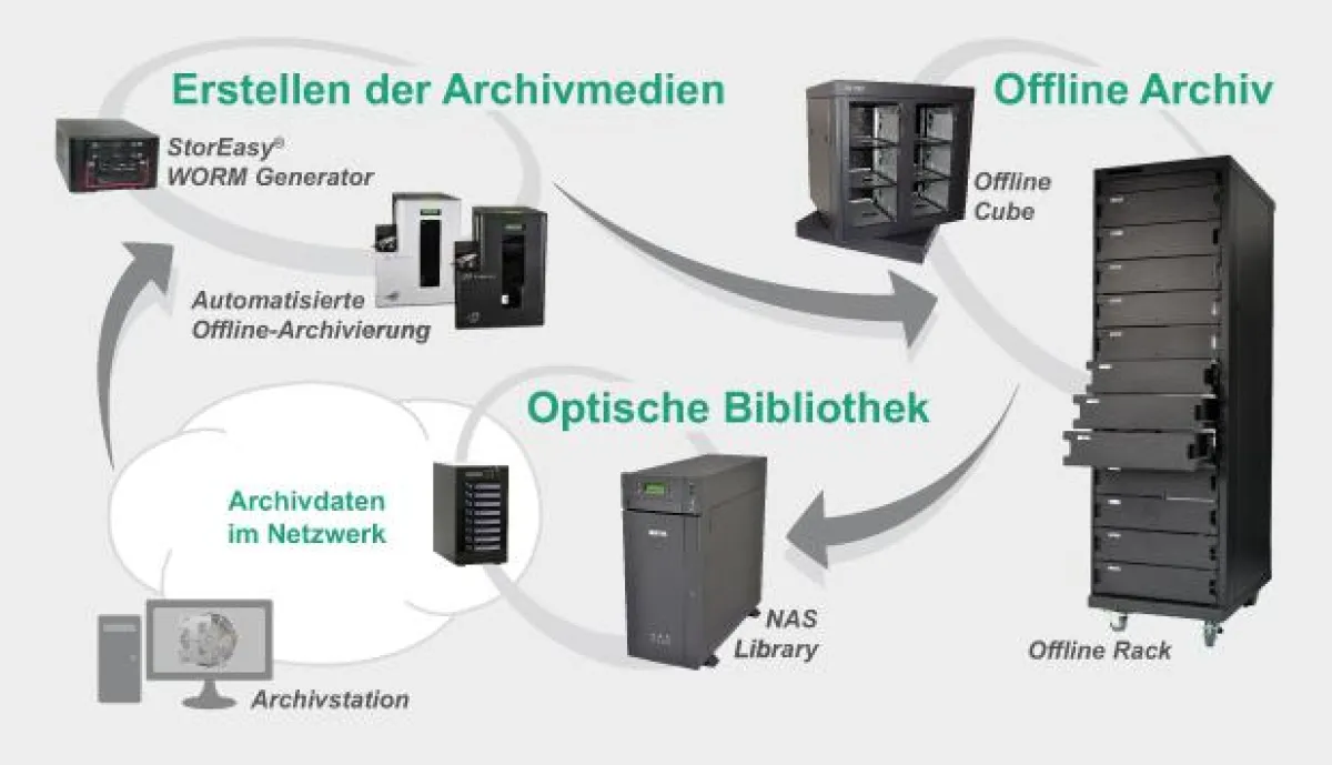 Mit dem StorEasy WORM-Generator wird ein Offline-Archiv erzeugt. Einsatzgebiet für diese Lösung sind Archive, auf deren Daten nicht direkt zugeriffen werden muss. Oftmals müssen Daten lediglich sicher verwahrt werden, wie z.B. Prozessdaten in der Produktion nach dem Produkthaftungsgesetz oder abgeschlossene Projekte bei Ingenieuren oder Architekten. Diese Daten werden von dem System abgeholt und automatisch auf gespiegelte Blu-rays geschrieben, können dem System entnommen und dann in einem sichereren Safe oder aber auch verschiedenen Brandschutzzonen aufbewahrt werden.