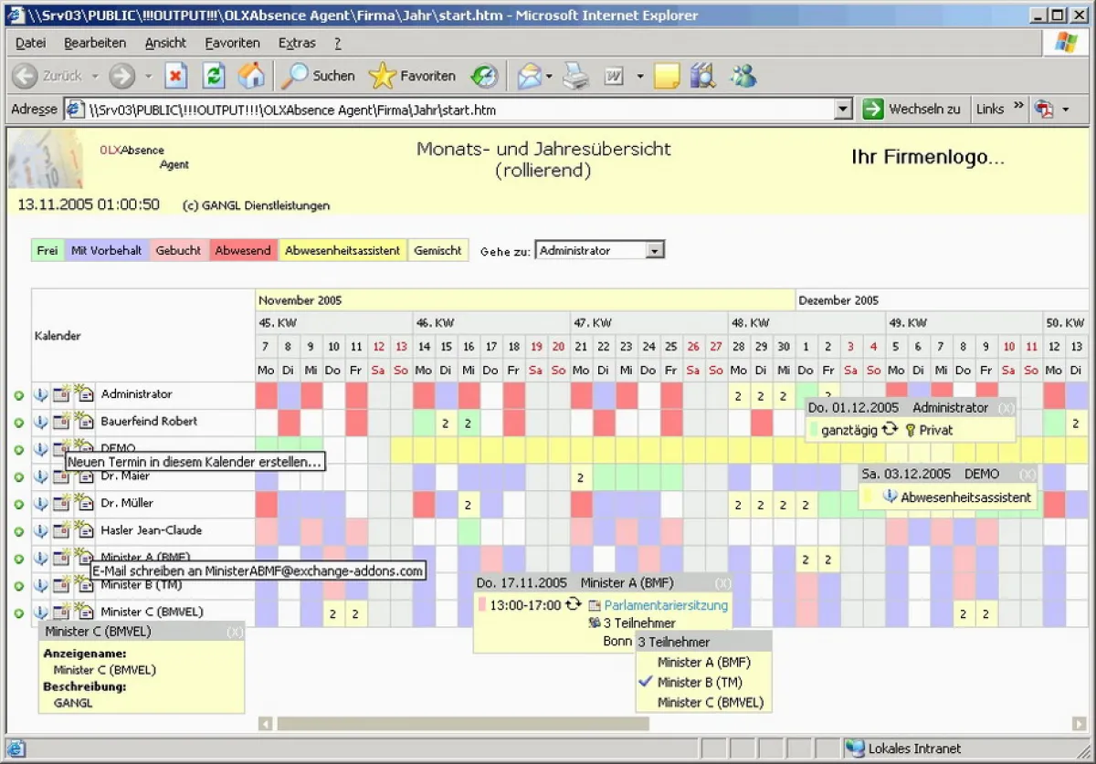 - Reports mit Legende, Verfügbarkeiten, Abwesenheitsinformationen