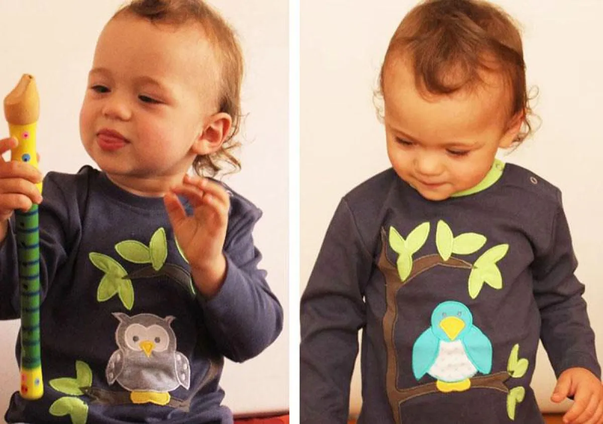 Den Spagat zwischen Zusammengehörigkeit und Autonomie schafft LIEBZWEI durch kleine Geschichten, die sich auf zwei Kleidungsstücken erzählen. Stehen die Kinder nebeneinander, ergibt sich das ganze Bild. So sitzt auf dem zweigeteilten "Zwillingsbaum" eine Eule bei dem einen Kind, und ein Spatz bei dem anderen. Der "Zwillingszug" teilt sich zwischen einer rauchenden Lok und ihren Wagons. Letzere sind auch ohne ihre Zugmaschine ein Hingucker, ein rosafarbener Dino ist ihr Passagier. Die eine Hälfte von dem "Zwillingsherz" ist mit Sternen, die andere mit Herzchen geschmückt. In einem weiteren Doppelset bringt dasselbe Stoffmuster der Krawatte- und Herzchen-Applikationen Jungen und Mädchen in Verbindung.