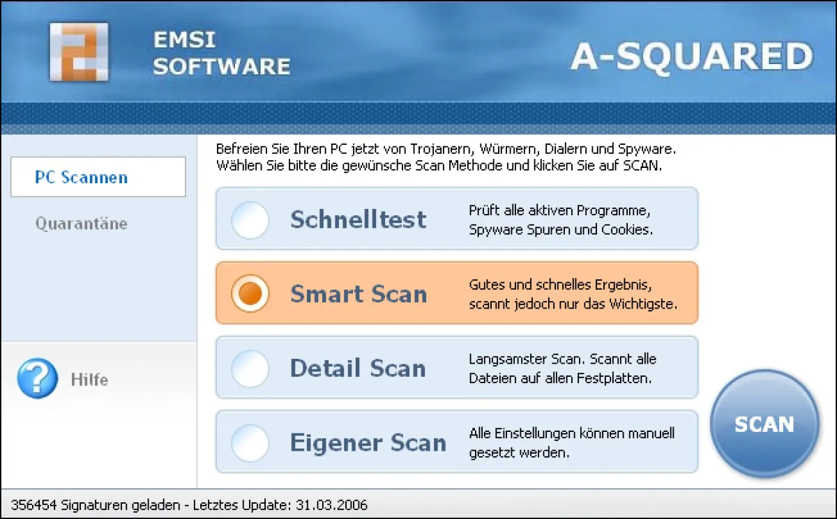 Der Benutzer wählt aus vier unterschiedlichen Scan-Funktionen die passende aus - in Abhängigkeit von der Zeit, die gerade für einen Scan zur Verfügung steht. Der Schnelltest etwa bietet ein sehr fixes Ergebnis, während die Detailanalyse des gesamten Computers schon ein wenig länger dauert. Wie bei den anderen a-squared Security Programmen, so gibt es auch hier eine abschaltbare Riskware-Erkennung. Sie macht den Anwender auf Programme aufmerksam, die zwar in der Regel harmlos sind, jedoch oftmals von Malware für bestimmte Aktionen mit verwendet werden.
