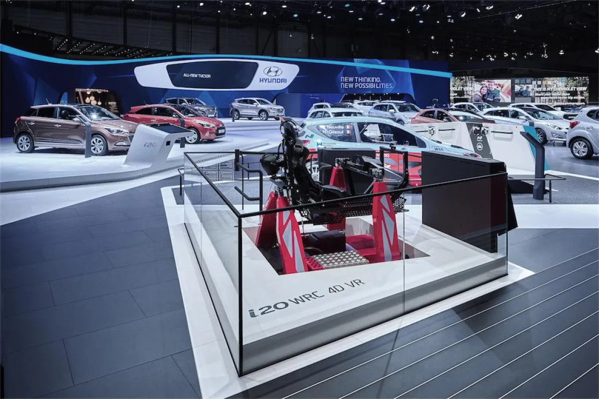 Der erste Fahrsimulator seiner Art, der Hyundai i20 WRC 4D VR+ Simulator, basiert auf einer Motion-Plattform, die Fliehkräfte von bis zu 0,5g simulieren kann. Eine Oculus Rift-Brille spielt die 360°-Rennaufzeichnung ab und kombiniert sie mit den Motion- und Audio-Daten des Rennfahrzeugs. So entsteht aus einer weltweit bisher ungesehenen Kombination von Technologien ein multisensorisches Fahrerlebnis. Eine eigens entwickelte Software führt die Bewegungen des Autos auf dem Rallyetrack abseits der Straße, den 360°-Film sowie die Fahrgeräusche zusammen. Zudem lässt ein Besucher-Screen Außenstehende an den Geschehnissen im Simulator teilhaben.