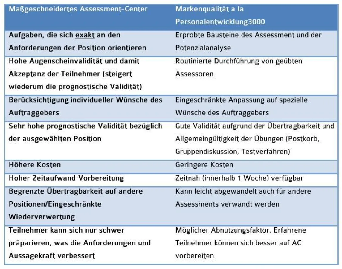 (openPR) Maßanzug oder Markenqualität – das ist hier die Frage. Wer schon einmal einen Anzug oder ein Kostüm gekauft hat, weiß dass die Entscheidung nicht leicht fällt. Sowohl für das eine wie das andere gibt es gute Argumente. Gleiches gilt für das Assessment-Center und die Potenzialanalyse. Auch hier sind eine individuelle Anpassung und/oder der Rückgriff auf bewährte Vorgaben möglich. Die Tabelle kann Ihnen als Entscheidungshilfe einen Überblick über die Vor- und Nachteile beider Optionen ohne Anspruch auf Vollständigkeit bieten.